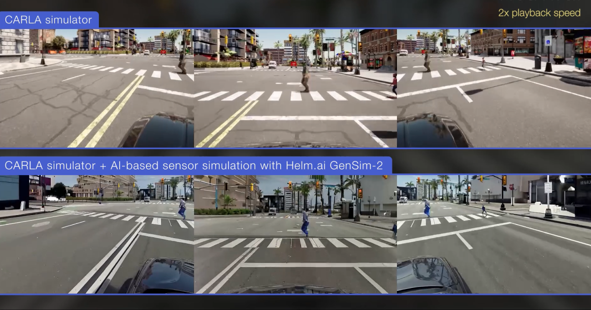 To demonstrate the model’s path prediction capabilities in a realistic, dynamic environment, Helm.ai deployed it in a closed-loop simulation using the open-source CARLA platform (see attached video). In this setting, Helm.ai Driver continuously responds to its environment, analogously to driving in the real world. Additionally, GenSim-2 re-rendered the simulated scenes to produce realistic camera outputs that closely resemble real-world visuals.